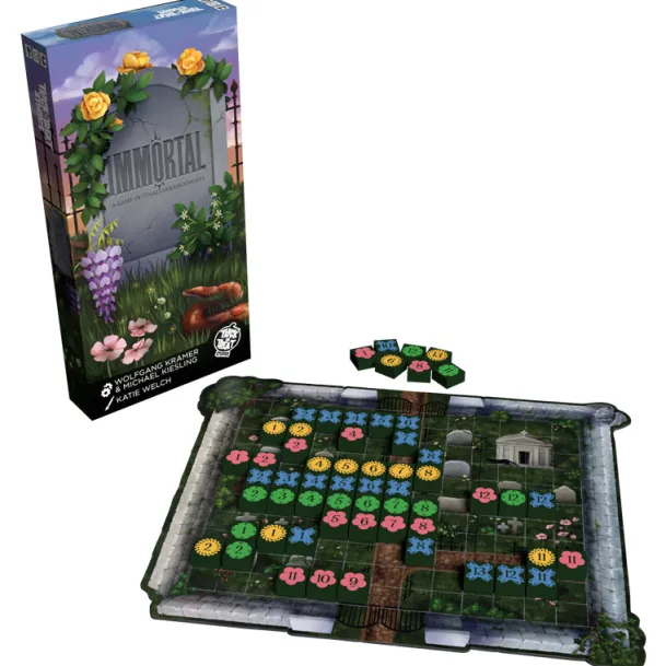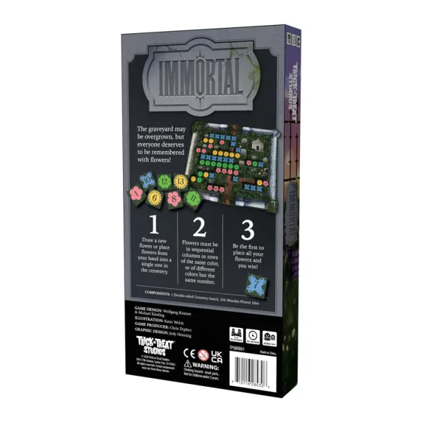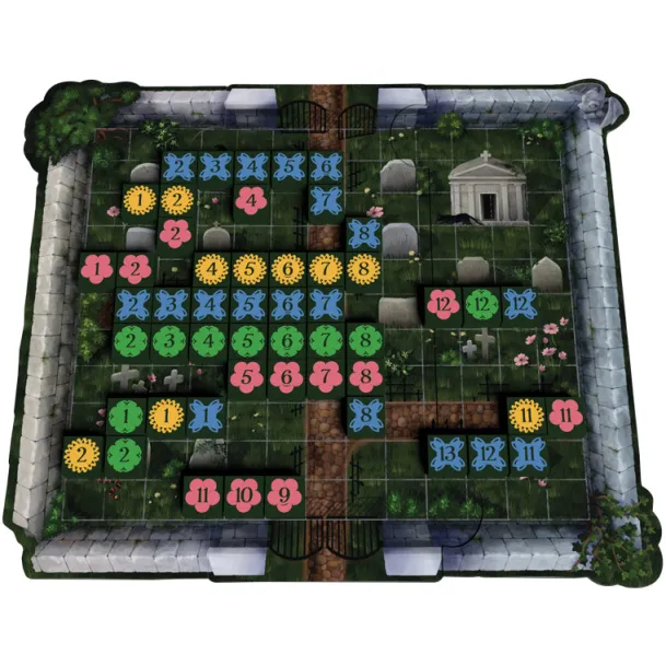 Players will take turns adding Flower tiles to their available flowers or placing them in rows or columns on the Cemetery board. Lines of Flowers must be either sequential numbers or the same number, but different colors. The player who places all their Flowers first is the winner!