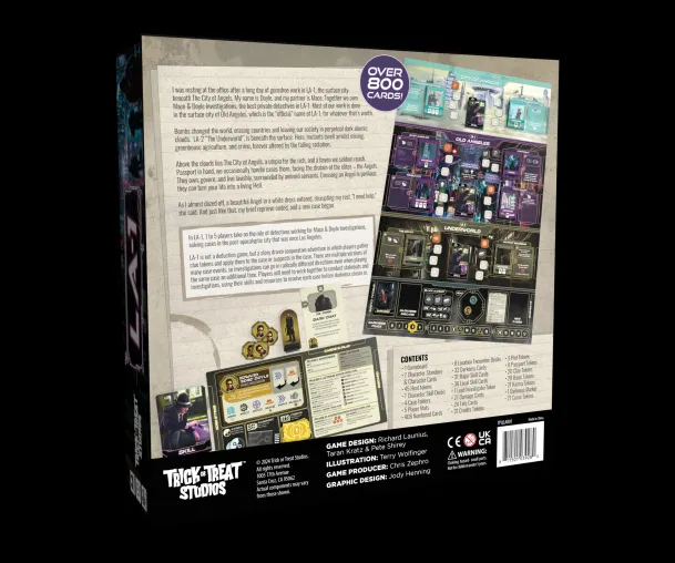 In LA-1, 1 to 5 players take on the role of detectives working for Mace & Doyle Investigations, solving cases in the post-apocalyptic city that was once Los Angeles. LA-1 is not a deduction game, but a story driven cooperative adventure in which players gather clue tokens and apply them to the case or suspects in the case. There are multiple versions of many case events, so investigations can go in radically different directions even when playing the same case an additional time. Players will need to work together to conduct stakeouts and investigations, using their skills and resources to resolve each case before darkness closes in.