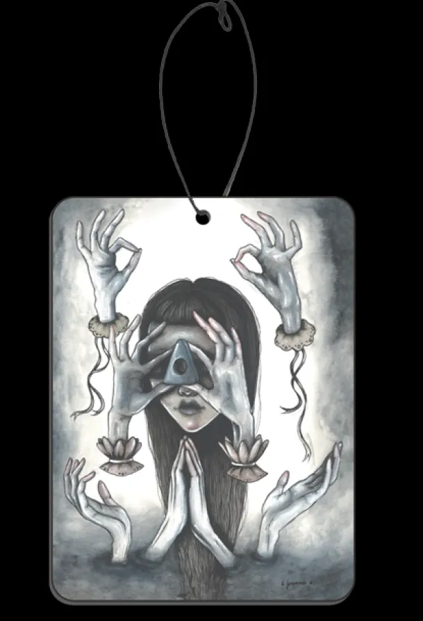 Show your fandom with your very own officially licensed Little Ghouls – The Magician – Fear Freshener®! This beautiful, black and white, air freshener comes with an elastic band to make it easy to attach to any place you want to smell clean and fresh. Check out more of the Little Ghouls unique and eerily beautiful artwork, candles and more at Little Ghouls Art.
