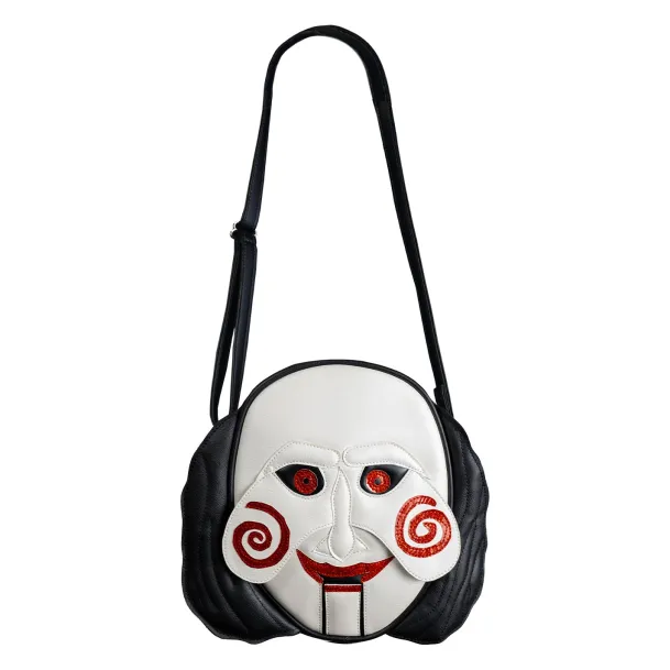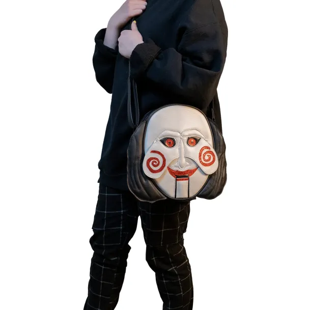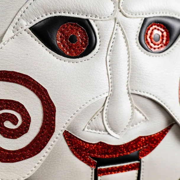 Trick or Treat Studios is proud to present the officially licensed, Saw – Billy Puppet Bag! This incredible purse, made using the highest quality Vegan Leather for excellent durability, has a soft inner lining with a large center pocket, as well as an inner side pocket. The outside features a layered design to accentuate details with red glitter accents and an adjustable strap for shoulder or cross body comfort.