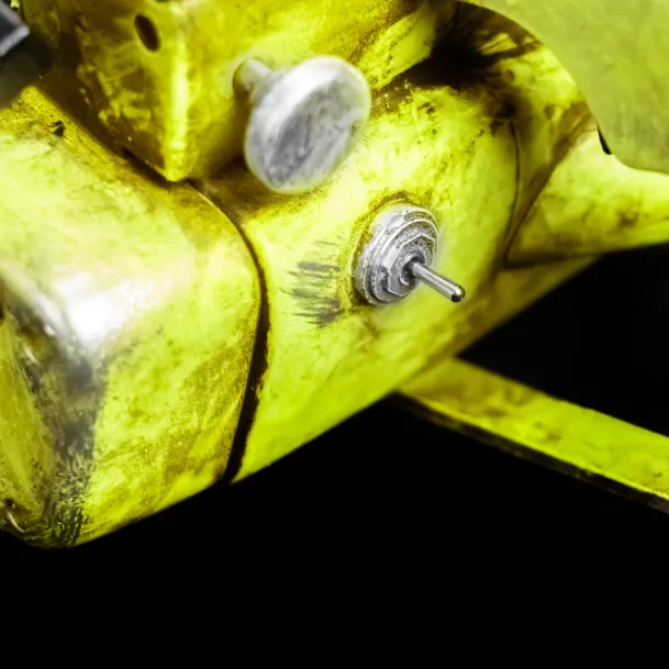A toggle switch activates the prop which has a constant motor idling sound effect when turned on. Pull the trigger to spin the chain and unleash chainsaw sound effects directly from the film!