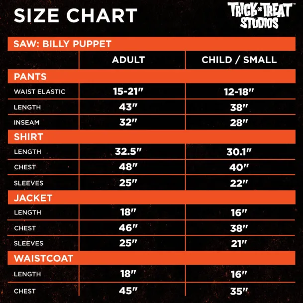 Complete the look with our officially licensed Billy Puppet mask (sold separately), and get ready to ask Trick-or-Treaters if they want to play a game this Halloween!