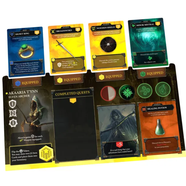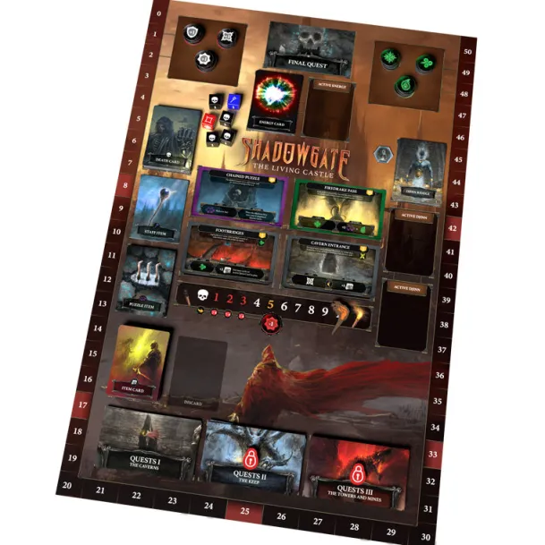 Five to find, three are one. One gives access, the Bladed Sun.The Silver Orb, to banish below. The Staff of Ages, to vanquish the foe. Joining two, the Golden Thorn. The last to invoke, the Platinum Horn. You have heard this prophecy many times, one regarding the chosen hero that will save the Westland from a great and rising darkness. Those days are now before you, for Talimar the Starless, the Warlock Lord‚ is once again moving in this world. He has descended far below Castle Shadowgate, ready to release a creature of immense power upon the world and bring it into chaos! Shadowgate The Living Castle is a 2-4 player board game based on the Macventure, Kemco NES and 2014 remake video game, Shadowgate. In it you’ll explore Shadowgate, the Living Castle, discovering relics and spells and completing legendary quests. Players can choose between eight characters that have their own unique class, traits, and abilities, then use these characters to compete for XP (experience points). For each item you equip, each quest you complete, each djinn riddle you answer, and each monster you defeat, you gain XP. Compete against other players to piece together the fabled Staff of Ages. It is only then will you be able to confront the Warlock Lord, fulfill the prophecy, and be crowned High Lord of the Westland! Player Count: 2-4, Play Time: 60 Minutes, Age Range: 14+